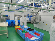 クリーニングのアピアは東北信を中心に5か所に工場を持ち運営しています。しかし、コロナ禍は業界にも大きな影響を及ぼし、冠婚葬祭やビジネス関連の受注が減少し、売り上げは一時3割程落ち込こみました。そこで最新鋭の機械を導入し、大手企業のユニフォーム関連と医療介護関連の営業に傾注しています。安売りをやめ1点1点の仕上がりに拘り安心で清潔な仕上がりを追及するように転換も行いました。工場内を食品系・工業系・医療介護系に区分けし、あえて分業の手間をかけ衛生面に重点を置きました。個人の受注は紛失・受け渡しミスのないように洗濯ネットを改良し特許も取りました。結果として受注も徐々に回復しています。工場入り口では白衣に着替え、エアシャワーで埃や虫などを中へ持ち込まぬようバリアシステムを導入し、食品工場と同等の衛生管理をしています。現在、使用している洗濯用洗剤は全てコロナウィルス対策用のものを使用し抗菌にも努めています。コード管理された大手企業の制服や作業着がラインを回り終えると畳まれた状態で集積されます。1時間に500着程のクリーニングが完成します。