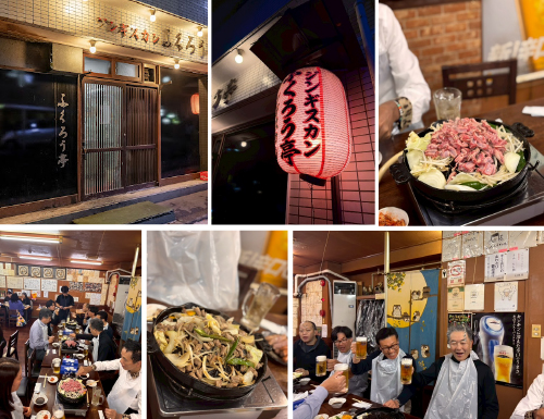 2日目の懇親会の始まりです。なかなか予約が取れないと有名なジンギスカン・ふくろう亭にて本場のジンギスカンとマッコリ酒をたらふく堪能させていただきました。店内ジンギスカンの煙とお客さんの食欲旺盛な熱気に包まれての食事でした。いろいろと焼き順にルールがあったみたいですが、関係なし!楽しい時間となりました。推薦いただいた遠藤社長、ゴチになりました!