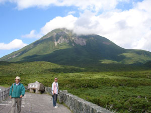 ▲知床連山の最高峰羅臼岳は標高1661mで知床で一番高い。「日本百名山」で日本最東端の山。中級登山コースで13.8kmあり7時間15分かかる。写真は知床横断道路「羅臼峠」での撮影風景 |